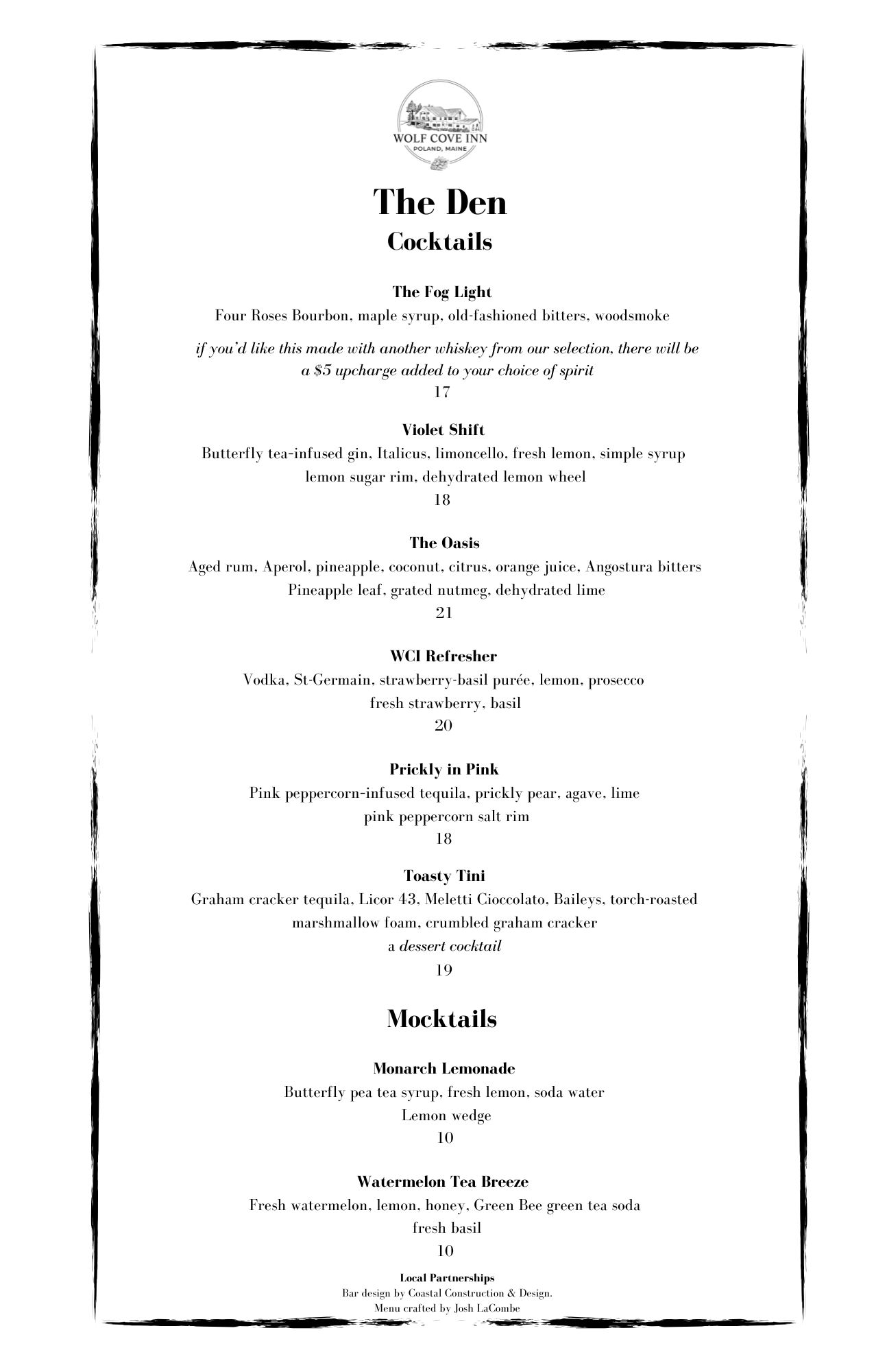 Crafted with reclaimed Maine wood, natural quartz, and a softly glowing atmosphere, The Den is an intimate bar designed to reflect the beauty of our surroundings—literally. A wall of mirrored glass tiles subtly catches the golden hues of the lake and sunset behind you, so even when your back is turned, Maine's magic is still in view. Locally made greenery frames the space with forest-inspired charm, while our seasonal cocktail menu highlights Maine-grown ingredients—from rhubarb and mint to blueberries and herbs from our own garden. With local draft beer, select bourbons, and organic wines rounding out the experience, The Den invites overnight guests to sip, connect, and savor the moment.